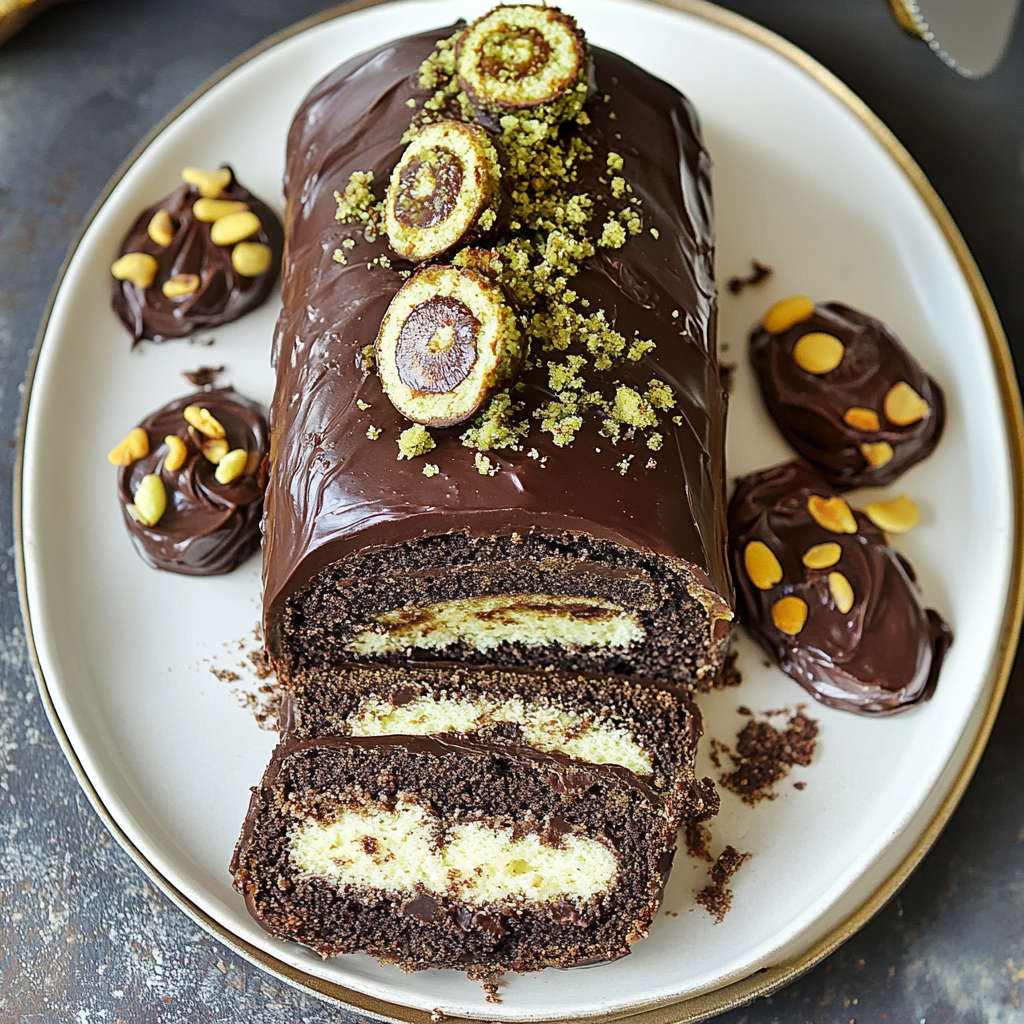 - Assemble by spreading ganache over the cooled cake, adding the pistachio filling, rolling tightly, and chilling.