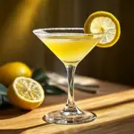 - Strain the mixture into a chilled martini glass and garnish with a slice of lemon.