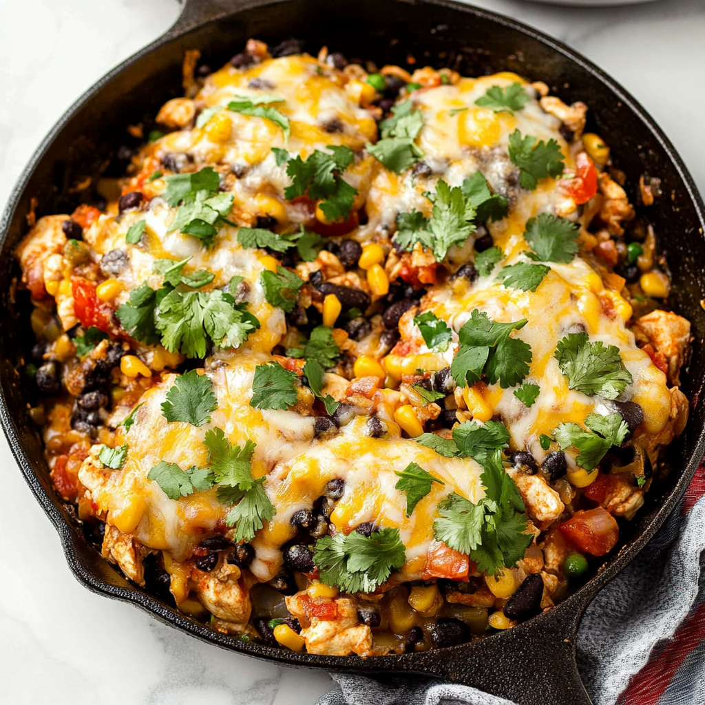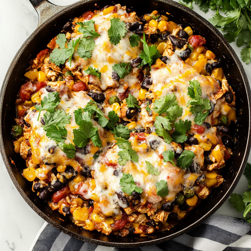 Top with fresh chopped cilantro if desired and serve immediately. Enjoy your delicious Santa Fe Chicken Skillet!